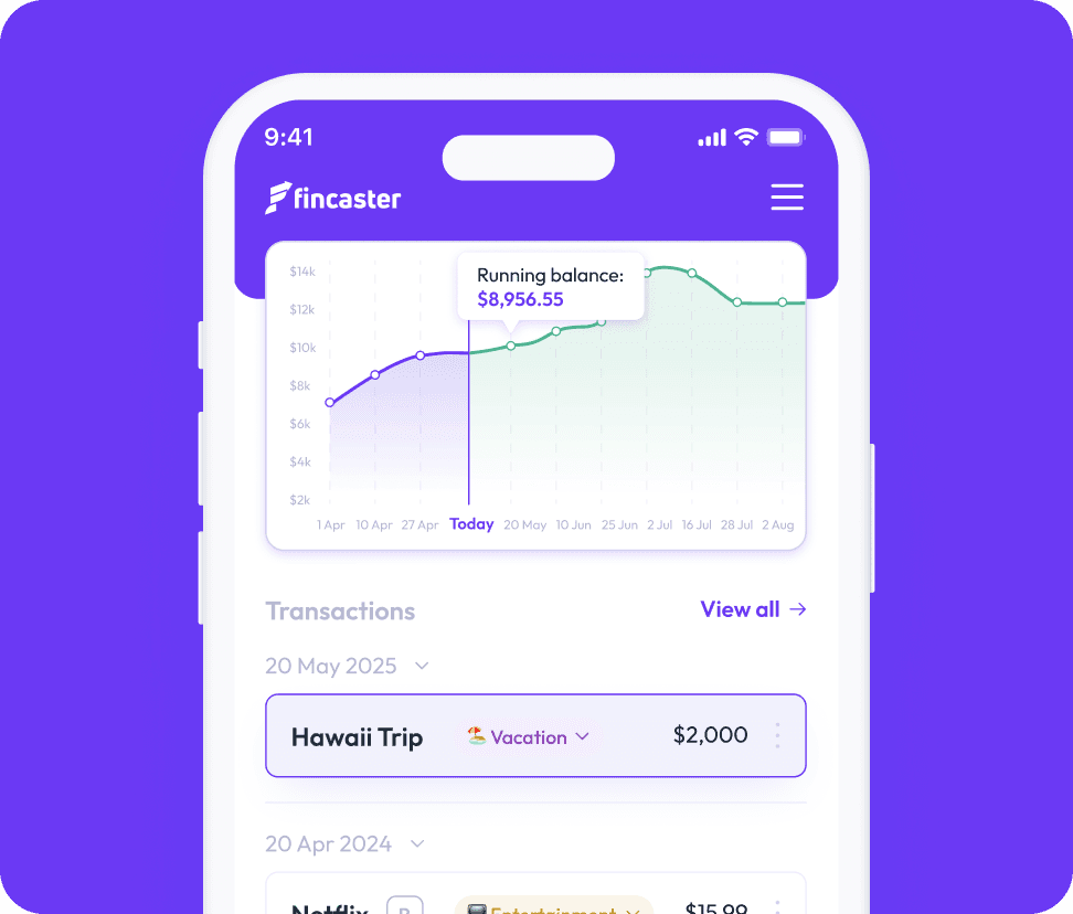 No more guessing your financial picture. Fincaster's real-time forecasting gives you an accurate view of your future bank balance based on your current transactions and planned expenses.
